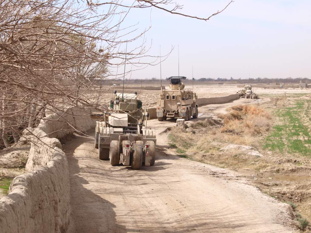 Two husky vehicles are using ground penetrating radars to detect IEDs along a narrow road near Kandahar while a cougar provides security.